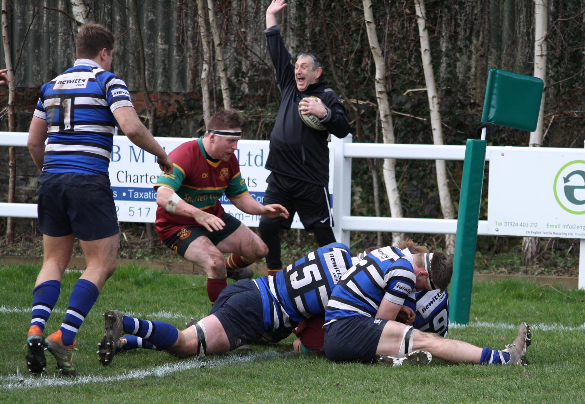 Heath began the game, playing towards the Stainland Road end, with a deep kick from Alex Bull putting pressure on the visitors defence from the off. Early exchanges saw both sides making mistakes with Heath having problems winning line outs but they were in control of scrums and Driffield were forced to make a change after 15 minutes replacing hooker Warren- Lambert to address the problem. Alex Bull was carded for an infringement but from the resulting penalty James Watts missed an easy chance for the visitors to take an early lead. Driffield began to ramp up the pressure but a super clearance from Dom Walsh relieved the any danger. Driffield came back strongly and from yet another penalty Watts missed the target much to the relief of the home crowd. This seemed to inspire the home side and Jack Pilcher went on a storming run before being hauled down by a struggling defence. Heath were awarded a penalty and opted for a quick tap from Walsh who released Jason Merrie and Joe Morrison before the centre was bundled into touch and the visitors cleared their lines. Next up Elliott Spiers and Callum Harriett-Brown linked well to set up another purge into the visitors defence as Bull returned on 25 minutes. Driffield had re-grouped and began to expose the home defence and it came as no surprise to see them breach the lines to go over for an unconverted try and a lead of 5-0 with 30 minutes played.