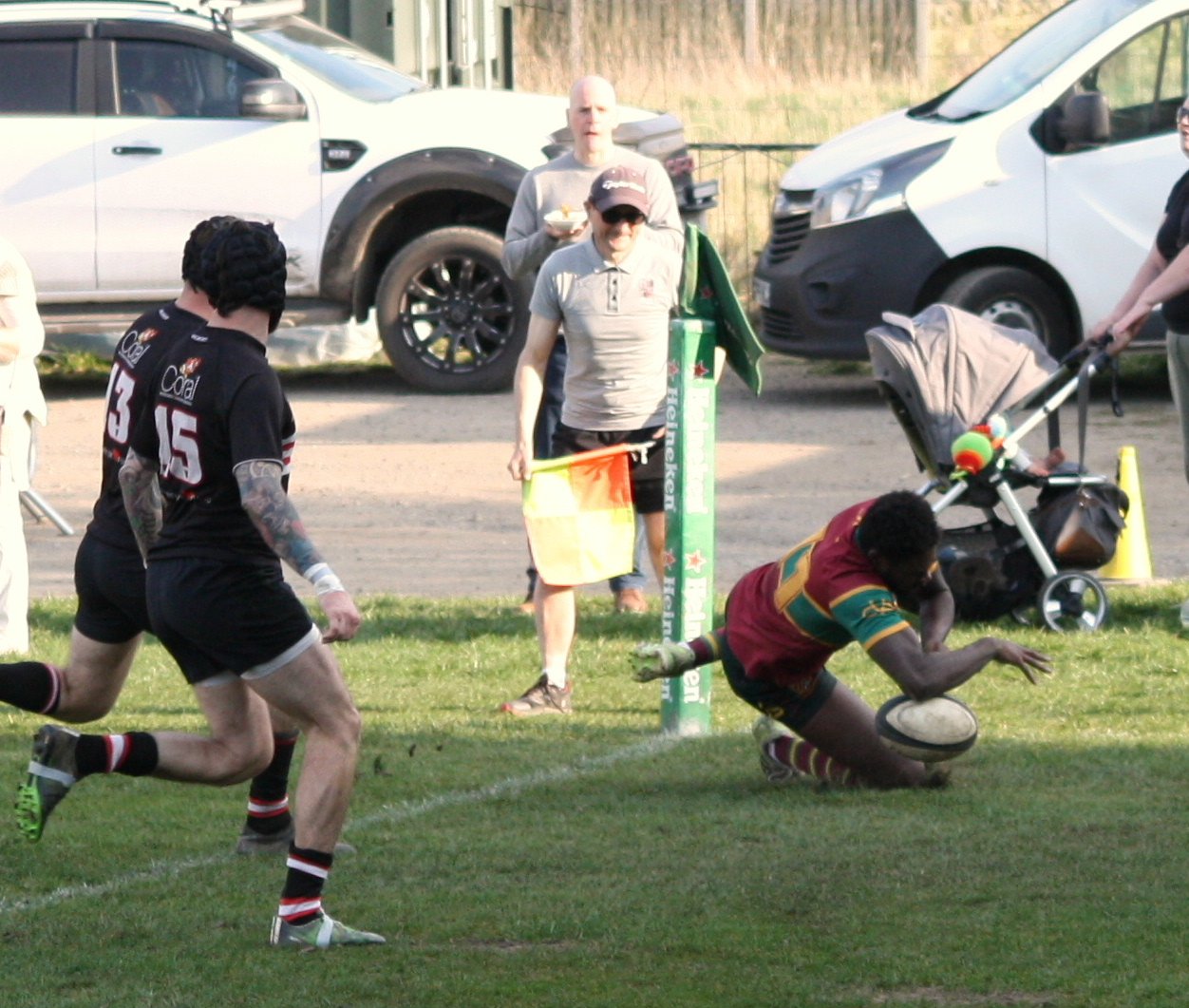 The visitors were quick to come back and with the Heath forwards getting the upper hand it came as no surprise to see Ben Stringer go over for a try to reduce the arrears to 7-5 with ten minutes played. It was a frantic start to a typical derby and from a scrum in the Heath 22 a quick pass from Dom Walsh to Callum Harriott-Brown saw the wingman set off on a flying run, exposing a weak home defence, to score in the corner Heaths second try. The kick from Bull was superbly converted and Heath fully deserved their 12-7 lead with fifteen minutes on the clock.