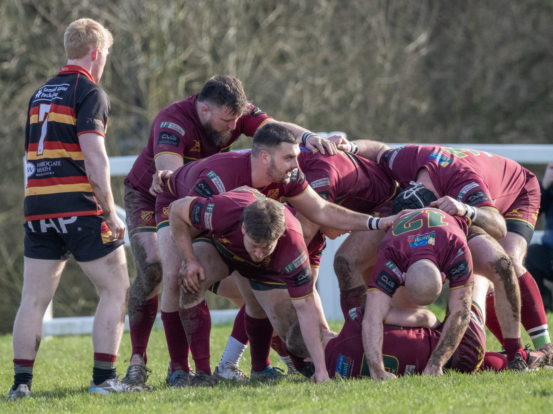 The home defence continued to struggle and on fifty minutes they had a player carded which saw Heath take full advantage. Joe Morrison was replaced by Elliott Spiers who was quickly involved in the action. Another Harrogate mistake from a high kick from Chris Johnson resulted in a scrum and Tom Clough drove off the back of the pack to score a hat trick, converted try 22-35 with sixty-five minutes played.