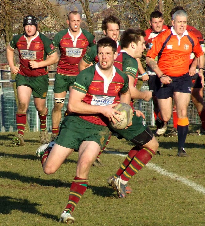 On the half hour, Heath were still dominant in the forwards but looking to make a breakthrough in the backs. A well taken line saw hooker Mark Puttick rampage up the centre. When stopped, he layed off to the supporting Hetherington, who got the backs into their stride with winger Dom Walsh sprinting for a well taken try, in the corner. This was well converted by Hinchliffe for Heath to come back into the game at 10 – 7.