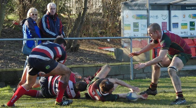 Somewhat against the run of play, Barnsley were 5 – 0 infront but had shown they were capable of playing basic rugby, creating the opportunities, then coming away with points. On twenty minutes, Barnsley were defending from a scrum in their 22, when their forwards broke out, creating space through poor Heath tackling in the inside backs. The ball went down the line to speedy winger Taylor, who scored an unconverted try outwide, for a 10 – 0 lead. Heath needed to regroup and stop the encounter drifting away from them.