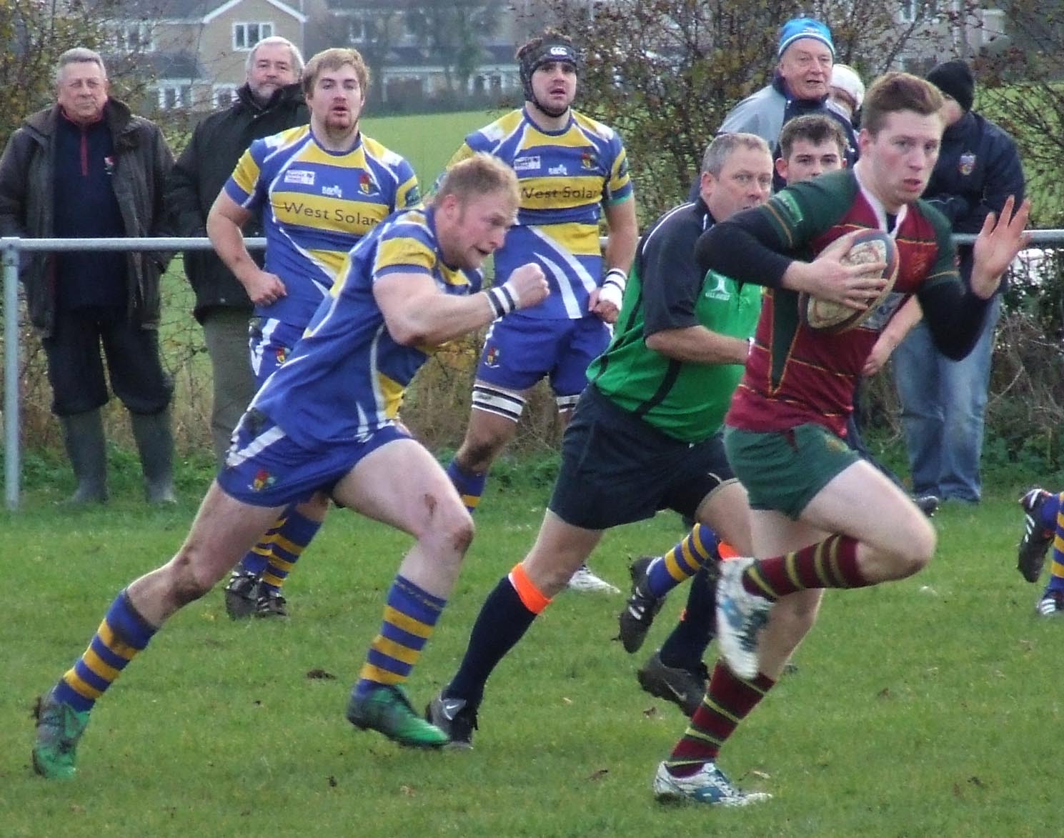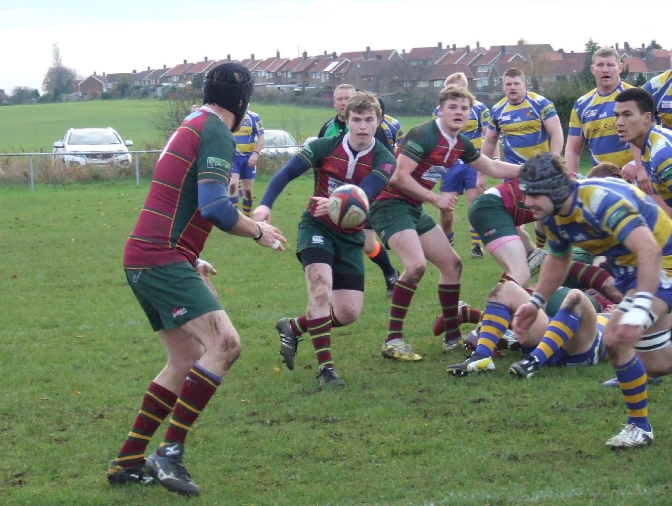 Dinnington kicked off on a cold sunny afternoon and within minutes Olly Cook was dumped heavily on his shoulder in an early exchange which epitomized the uncompromising tackling that was be a feature of the game from both teams. Dinnington ran strongly and their fly-half Jonny West timed his pass perfectly to Ollie Rodgers who scored near the posts after 7 minutes. West converted and Dinnington led by 7 – 0.