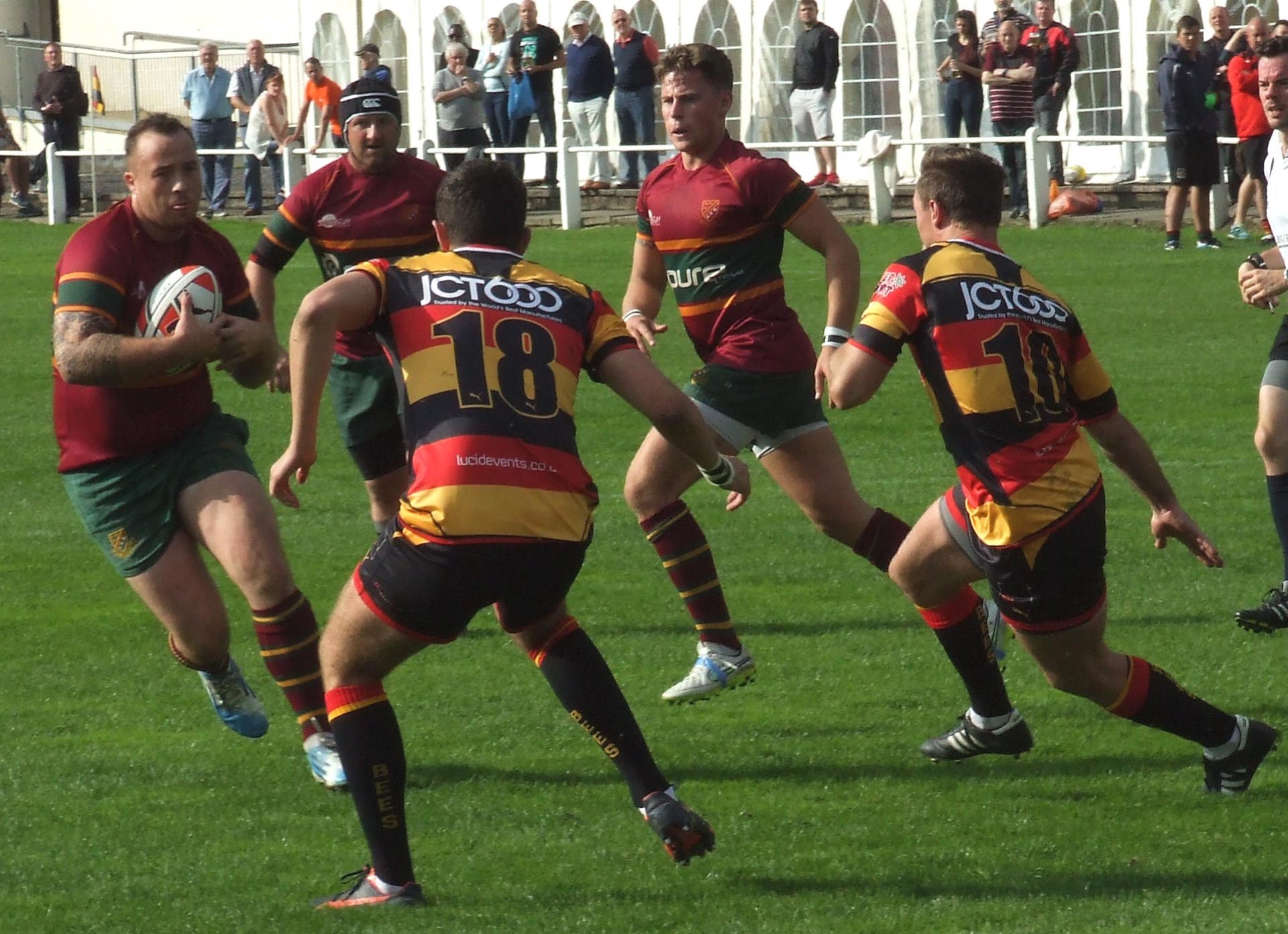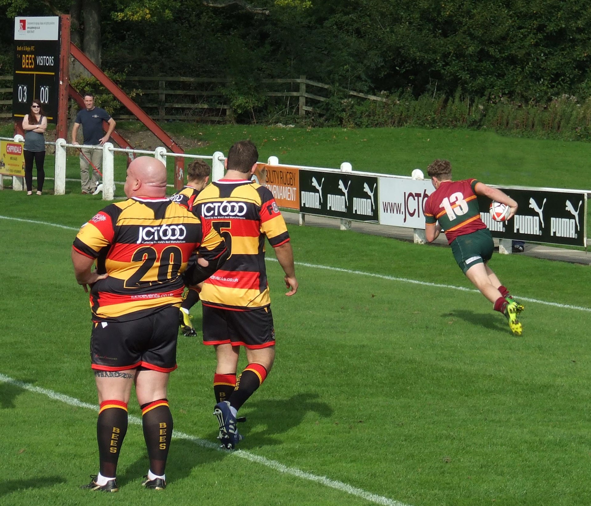 15 minutes in, a good kick for touch by Ezra Hinchliffe set up the first real chance for Heath and from the lineout the pack pushed for the line. The ball came out for scrum-half Dominic Walsh to pass to fly-half Mark Sales and his slick pass inside made the opening for Hinchliffe to scythe through the Bees defence and go under the posts. Jack Crabtree converted to put Heath ahead: 3 – 7.