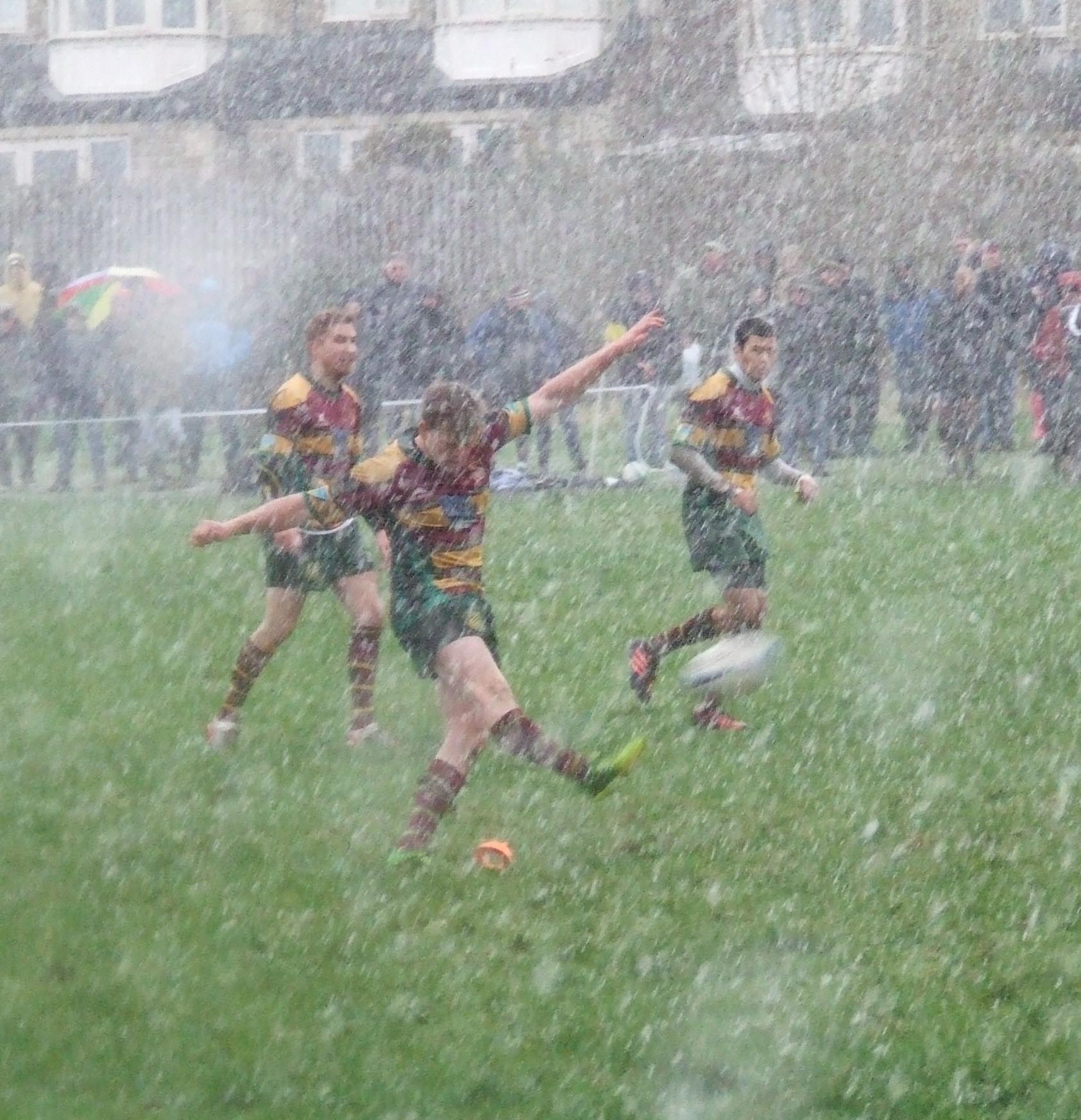 The game was changed from Broomfield, deemed unplayable, to the school field at Kensington. It started in blizzard conditions and it was Heath who made the best of them playing up the slope. Following a superb tackle from Josh White Old Crossleyans lost the services of goal kicker Ryan Sweeney in the first 5 minutes causing the home side to reorganise their back line and this seemed to ignite Crocs as they mounted an attack on the Heath try line. However, when the ball was spilled on the half way line Baxendale pounced and raced away to go under the posts for the opening try, converted by Ezra Hinchliffe and Heath led 7-0 after 12 minutes for a great start.
