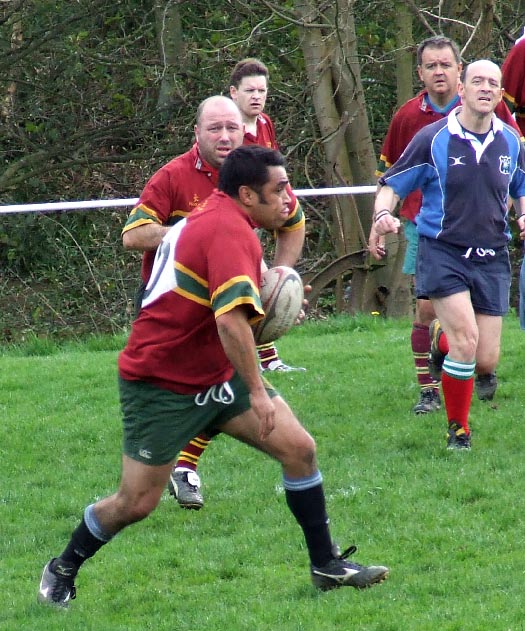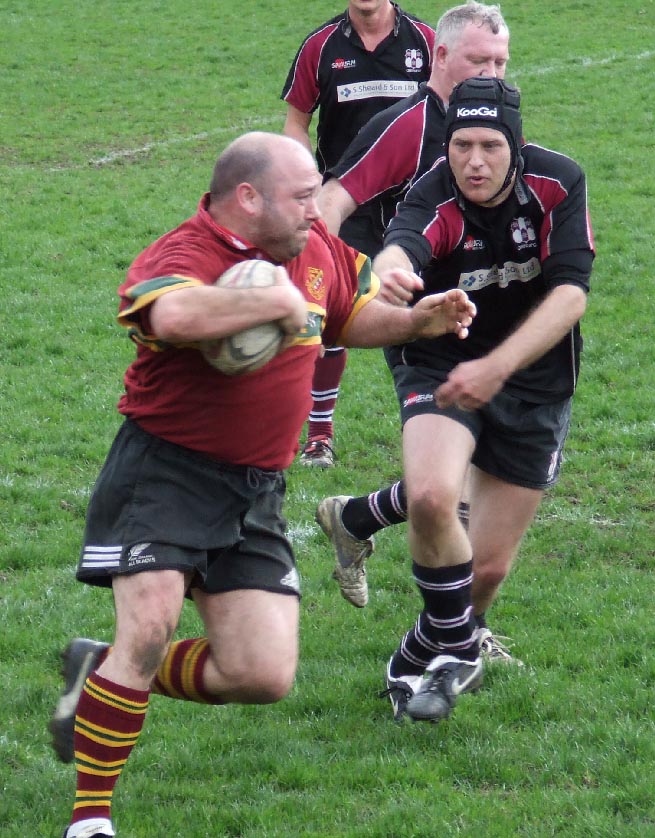 From the kick off, play was fairly even, though the generally younger but less experienced home XV looked quicker around the park. Indeed, it was the Rishes who opened their account the first. On 16 minutes their efforts were rewarded when the ball was popped out from Cheesie's last ditch tackle, for a try near the posts. The conversion was missed, but Rishes were now 5 – 0 up.