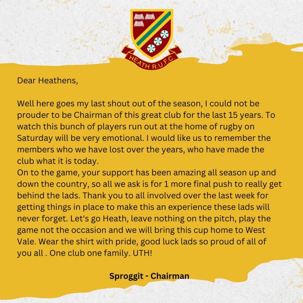 The Heath players will be roared on by their faithful band of supporters who have followed them the length of the country in the last few years as they have risen into the regional leagues.